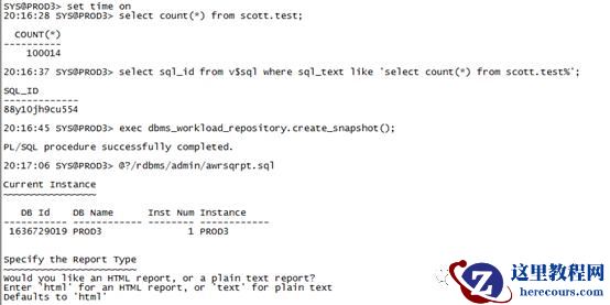 --示范例SYS@PROD3> set time on20:23:23 SYS@PROD3> select count(*) from scott.test;COUNT(*)----------10001420:23:35 SYS@PROD3> select count(*) from scott.test;COUNT(*)----------10001420:23:36 SYS@PROD3> select sql_id from v$sql where sql_text like 'select count(*) from scott.test%';SQL_ID-------------88y10jh9cu55420:23:47 SYS@PROD3> exec dbms_workload_repository.create_snapshot();PL/SQL procedure successfully completed.20:24:31 SYS@PROD3> @?/rdbms/admin/awrsqrpt.sqlCurrent Instance~~~~~~~~~~~~~~~~DB Id DB Name Inst Num Instance----------- ------------ -------- ------------1636729019 PROD3 1 PROD3Specify the Report Type~~~~~~~~~~~~~~~~~~~~~~~Would you like an HTML report, or a plain text report?Enter 'html' for an HTML report, or 'text' for plain textDefaults to 'html'Enter value for report_type:Type Specified: htmlInstances in this Workload Repository schema~~~~~~~~~~~~~~~~~~~~~~~~~~~~~~~~~~~~~~~~~~~~DB Id Inst Num DB Name Instance Host------------ -------- ------------ ------------ ------------* 1636729019 1 PROD3 PROD3 cs-0000zzskpr2Using 1636729019 for database IdUsing 1 for instance numberSpecify the number of days of snapshots to choose from~~~~~~~~~~~~~~~~~~~~~~~~~~~~~~~~~~~~~~~~~~~~~~~~~~~~~~Entering the number of days (n) will result in the most recent(n) days of snapshots being listed. Pressing <return> withoutspecifying a number lists all completed snapshots.Enter value for num_days: 1Listing the last day's Completed SnapshotsSnapInstance DB Name Snap Id Snap Started Level------------ ------------ --------- ------------------ -----PROD3 PROD3 3783 09 Apr 2020 00:01 13784 09 Apr 2020 02:00 13785 09 Apr 2020 03:00 13786 09 Apr 2020 04:01 13787 09 Apr 2020 05:00 13788 09 Apr 2020 06:00 13789 09 Apr 2020 07:00 13790 09 Apr 2020 08:00 13791 09 Apr 2020 09:00 13792 09 Apr 2020 10:00 13793 09 Apr 2020 11:00 13794 09 Apr 2020 12:00 13795 09 Apr 2020 13:00 13796 09 Apr 2020 14:00 13797 09 Apr 2020 15:00 13798 09 Apr 2020 16:00 13799 09 Apr 2020 17:00 13800 09 Apr 2020 18:00 13801 09 Apr 2020 19:00 13802 09 Apr 2020 20:00 13803 09 Apr 2020 20:17 13804 09 Apr 2020 20:24 1Specify the Begin and End Snapshot Ids~~~~~~~~~~~~~~~~~~~~~~~~~~~~~~~~~~~~~~Enter value for begin_snap: 3803Begin Snapshot Id specified: 3803Enter value for end_snap: 3804End Snapshot Id specified: 3804Specify the SQL Id~~~~~~~~~~~~~~~~~~Enter value for sql_id: 88y10jh9cu554SQL ID specified: 88y10jh9cu554Specify the Report Name~~~~~~~~~~~~~~~~~~~~~~~The default report file name is awrsqlrpt_1_3803_3804.html. To use this name,press <return> to continue, otherwise enter an alternative.Enter value for report_name: awrsqlrpt_1_3803_3804.html……………………<br /><a class="awr" href="#top">Back to Top</a><p /></body></html>Report written to awrsqlrpt_1_3803_3804.html