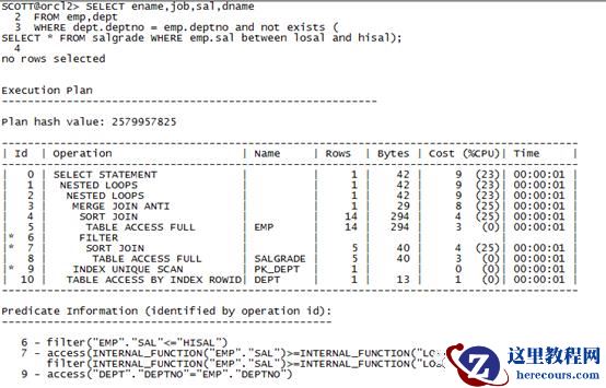 SELECT ename,job,sal,dnameFROM emp,deptWHERE dept.deptno = emp.deptno and notexists ( SELECT * FROM salgradeWHERE emp.sal between losal and hisal);
