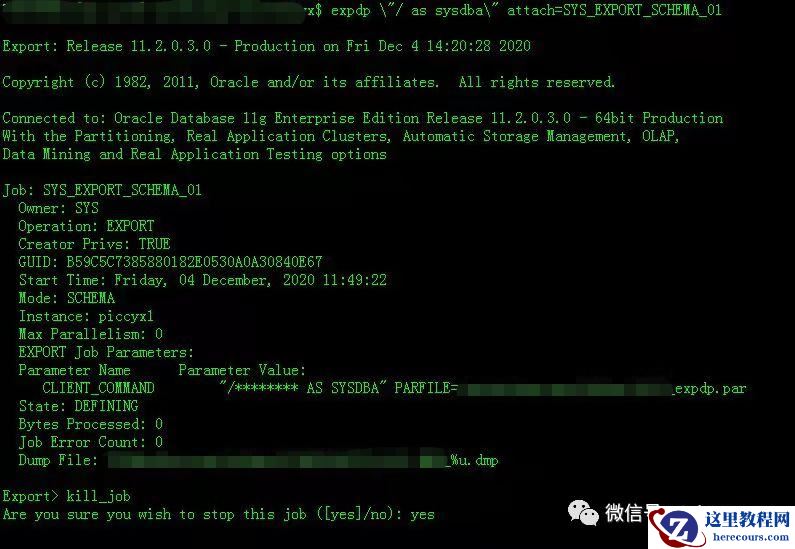 JIEKEUR1:[JiekeXu1]/newbackup/Jieke$ expdp \"/ as sysdba\" attach=SYS_EXPORT_TABLE_02Export: Release 11.2.0.3.0 - Production on Fri Dec 4 21:53:16 2020Copyright (c) 1982, 2011, Oracle and/or its affiliates. All rights reserved.Connected to: Oracle Database 11g Enterprise Edition Release 11.2.0.3.0 - 64bit ProductionWith the Partitioning, Real Application Clusters, Automatic Storage Management, OLAP,Data Mining and Real Application Testing optionsJob: SYS_EXPORT_TABLE_02Owner: SYSOperation: EXPORTCreator Privs: TRUEGUID: B5A4B3B38E0A00FEE0530A0A30841115Start Time: Friday, 04 December, 2020 21:46:24Mode: TABLEInstance: JiekeXu1Max Parallelism: 0EXPORT Job Parameters:Parameter Name Parameter Value:CLIENT_COMMAND "/******** AS SYSDBA" directory=EXP_Jieke_DIR logfile=exp_to_AT_CLAIMTASK.log dumpfile=AT_CLAIMTASK_%U.dmp tables=KHEF.AT_CLAIMTASKState: DEFININGBytes Processed: 0Job Error Count: 0Dump File: /newbackup/Jieke/KHEF.AT_CLAIMTASK_%u.dmpExport> help------------------------------------------------------------------------------The following commands are valid while in interactive mode.Note: abbreviations are allowed.ADD_FILEAdd dumpfile to dumpfile set.CONTINUE_CLIENTReturn to logging mode. Job will be restarted if idle.EXIT_CLIENTQuit client session and leave job running.FILESIZEDefault filesize (bytes) for subsequent ADD_FILE commands.HELPSummarize interactive commands.KILL_JOBDetach and delete job.PARALLELChange the number of active workers for current job.REUSE_DUMPFILESOverwrite destination dump file if it exists [N].START_JOBStart or resume current job.Valid keyword values are: SKIP_CURRENT.STATUSFrequency (secs) job status is to be monitored wherethe default [0] will show new status when available.STOP_JOBOrderly shutdown of job execution and exits the client.Valid keyword values are: IMMEDIATE.Export> KILL_JOBAre you sure you wish to stop this job ([yes]/no): yes^CUDE-00001: user requested cancel of current operation