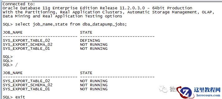 使用数据泵 expdp user/passwd attatch=job_name 交互式方式查看也只有一个任务且为 DEFINING 异常状态,kill_job 卡住无法执行完毕,只能取消掉 kill 操作系统进程。