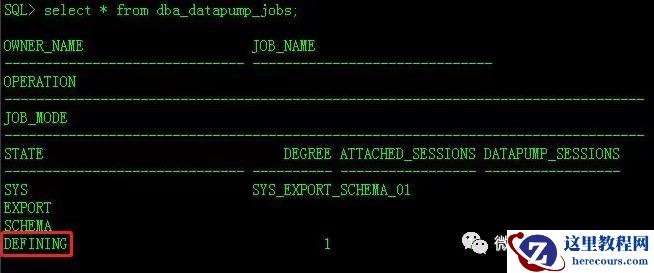 ps -ef | grep expdp 查看导出进程还在,只不过通过数据库查看 job 发现 state 竟然是 DEFINING 状态,没有 EXECUTING 状态的。