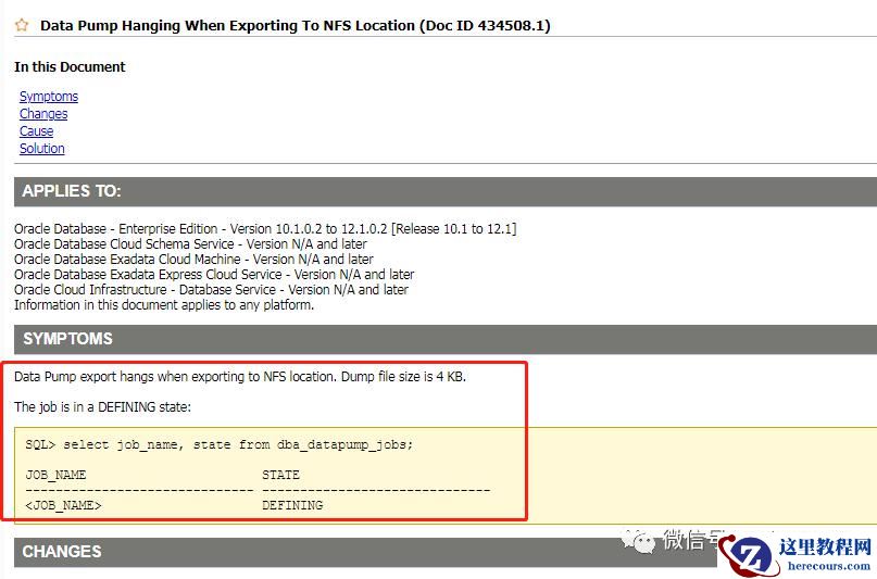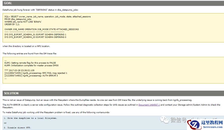 后面看到 MOS 有篇文章说 AIX 挂载 NFS 文件系统有问题,解决办法竟然是禁用 NFS 或者存储文件到本地。。。之前也使用 AIX 挂载文件系统多次未发现问题,感觉这个有点扯,便没有再去理会这个了,继续查询下一个。DataPump Export/Import Hangs With "DEFINING" Status When Using A Directory On NFS Filesystem (文档 ID 2262196.1)