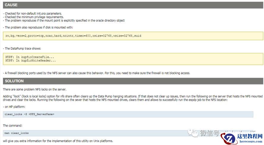 另一篇 Data Pump Hanging When Exporting To NFS Location (Doc ID 434508.1)中说需要添加 llock 本地锁,但是由于操作系统上没有 clear_locks 命令,便放弃了此方案。