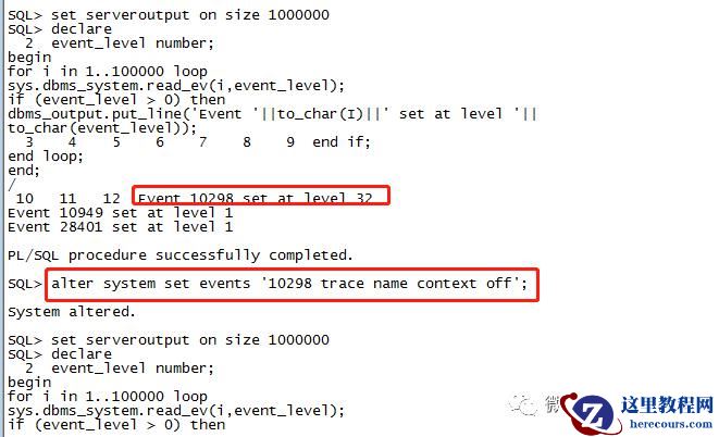 SQL> alter system set events '10298 trace name context forever, level 32';System altered.SQL> set serveroutput on size 1000000SQL> declare2 event_level number;beginfor i in 1..100000 loopsys.dbms_system.read_ev(i,event_level);if (event_level > 0) thendbms_output.put_line('Event '||to_char(I)||' set at level '||to_char(event_level));3 4 5 6 7 8 9 end if;end loop;end;/10 11 12 Event 10298 set at level 32Event 10949 set at level 1Event 28401 set at level 1PL/SQL procedure successfully completed.SQL> alter system set events '10298 trace name context off';System altered.SQL> set serveroutput on size 1000000SQL> declare2 event_level number;beginfor i in 1..100000 loopsys.dbms_system.read_ev(i,event_level);if (event_level > 0) thendbms_output.put_line('Event '||to_char(I)||' set at level '||to_char(event_level));end if;3 4 5 6 7 8 9 10 end loop;11 end;/ 12Event 10949 set at level 1Event 28401 set at level 1PL/SQL procedure successfully completed.