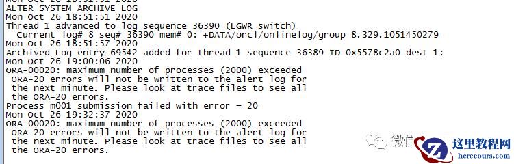 当登陆到数据库检查数据库状态无异常,查看监听也是正常,那么集群资源状态也是正常。查看数据库后台日志时发现了错误 "ORA-00020:maximum number of processes(2000) exceeded" 连接数达到最大值 2000.查看当前数据库最大连接数设置为 2000,查看数据库除后台进程外两节点数均为 1940 多,外加 50 多个已经超出 2000 了。
