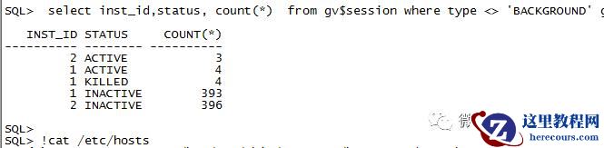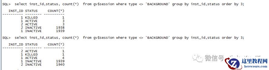14:03:19 SQL> alter system kill session '1938,3645';System altered.……………………………省略部分……………………………14:03:19 SQL> alter system kill session '1943,3215';System altered.14:03:24 SQL> select 'alter system kill session '''||sid||','||serial#||'''; 'from v$session s where s.STATUS='INACTIVE' and type <> 'BACKGROUND' and LOGON_TIME<=(sysdate-1/24);'ALTERSYSTEMKILLSESSION'''||SID||','||SERIAL#||''';'--------------------------------------------------------------------------------alter system kill session '59,19341';alter system kill session '458,3637';……………………………省略部分……………………………alter system kill session '1952,5867';alter system kill session '1971,2023';14:06:34 SQL> select inst_id,count(*) from gv$session group by inst_id;INST_ID COUNT(*)---------- ----------1 11972 119414:06:40 SQL> select inst_id,status, count(*) from gv$session where type <> 'BACKGROUND' group by inst_id,status order by 3;INST_ID STATUS COUNT(*)---------- -------- ----------2 ACTIVE 11 ACTIVE 41 INACTIVE 5431 KILLED 5942 INACTIVE 1138节点 2 这里又通过 kill -9 杀掉会话,节点 2 的非活跃会话得到释放,但是节点 1 的 KILLED 的会话还是没明显的下降 。SQL> select inst_id,status, count(*) from gv$session where type <> 'BACKGROUND' group by inst_id,status order by 3;INST_ID STATUS COUNT(*)---------- -------- ----------1 ACTIVE 32 ACTIVE 41 INACTIVE 3971 KILLED 5922 INACTIVE 671