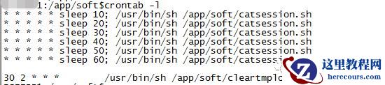 JIEKEDB1:/app/soft$crontab -l* * * * * sleep 10; /usr/bin/sh /app/soft/catsession.sh* * * * * sleep 20; /usr/bin/sh /app/soft/catsession.sh* * * * * sleep 30; /usr/bin/sh /app/soft/catsession.sh* * * * * sleep 40; /usr/bin/sh /app/soft/catsession.sh* * * * * sleep 50; /usr/bin/sh /app/soft/catsession.sh* * * * * sleep 60; /usr/bin/sh /app/soft/catsession.sh30 2 * * * /usr/bin/sh /app/soft/cleartmplog.sh