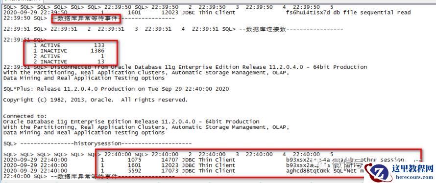 最后,搂一眼生成的日志, session_history_2020-09-29.log 日志中每 10 秒则会显示 SQL 查询结果,但是有 SQLPlus 登入登出信息,显示的格式不是很友好,脚本可以继续优化。我这里是 AIX 6.1 ADG 备库上的信息,部分 Shell 命令在操作系统上不好用,但 Linux 系统则没有问题,希望看到的小伙伴们可以在尝试一下。