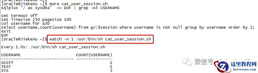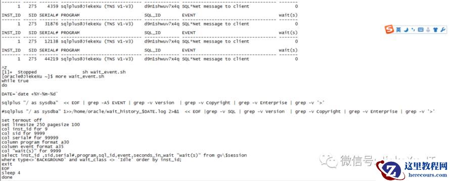[oracle@JiekeXu ~]$ more wait_event.shwhile truedoDATE=`date +%Y-%m-%d`sqlplus "/ as sysdba" << EOF | grep -A5 EVENT | grep -v Version | grep -v Copyright | grep -v Enterprise | grep -v '>'#sqlplus "/ as sysdba" 1>>/home/oracle/wait_history_$DATE.log 2>&1 << EOF |grep -v SQL | grep -v Version | grep -v Copyright | grep -v Enterprise | grep -v '>'set termout offset linesize 250 pagesize 100col inst_id for 9col sid for 9999col serial# for 99999column program format a30column event format a35col "wait(s)" for 9999--set timing onselect inst_id ,sid,serial#,program,sql_id,event,seconds_in_wait "wait(s)" from gv\$sessionwhere type<>'BACKGROUND' and wait_class <> 'Idle' order by inst_id;exitEOFsleep 5done