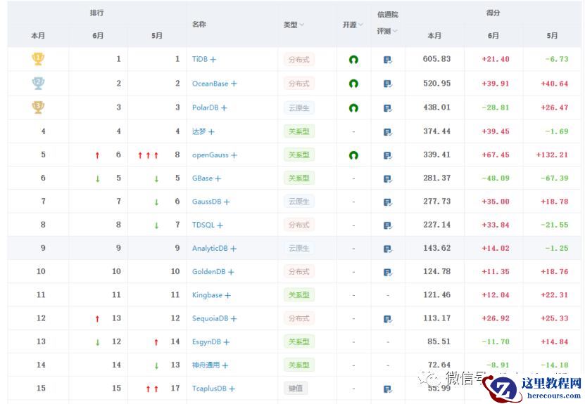 纵观榜首,前四名三个月来的位置均没有太大变化,平凯星辰 TiDB 以 605.83 的高分处于领先地位,奥星贝斯 OceanBase 以 520.95 分位于第二,和 TiDB 仅差 84.88 分,差距逐渐拉小,下半年内他两能否一较高低还需期待;阿里云 PolarDB 以 438.01 分位于第三,但涨幅和上月相比还是处于下跌状态,下跌 28.81 分足以让紧随其后的武汉达梦 DM 赶上,如果本月还继续下跌真就不好说了。再看华为 openGauss 以 67.45 分本月最高涨分一举拿下排行榜第五,成为众多璀璨明星中最耀眼的一颗,当然这也得益于上个月有多家企业加入 openGauss 社区,成立一周年的 openGauss 社区动作频繁,硕果累累,增长快速,可谓是实打实的“黑马”选手;反观上个月排名第五的南达通用 GBase 本月继续下跌 48.89 分丢失排行榜第五的宝座,希望 GBase 能铆足干劲重回第五宝座。
