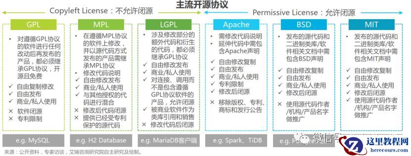 CLA (公司贡献者许可协议)是 Contributor License Agreement 的缩写,CLA 可以看做是对开源软件本身采用的开源协议的补充。说到开源协议,当今开源数据库应用的开源许可协议主要包括两派:一派是以 GPL、 MPL、 LGPL 协议为代表的 Copyleft License,严格执行开源精神,不允许修改代码后闭源,其中 GPL 更是做了进一步的要求,不允许修改后的新代码更改开源协议。另一派是以 BSD、 MIT、 APACHE、木兰开源协议为代表的 Permissive License,允许修改代码后闭源,因此较受商业公司青睐,如下图所示。
