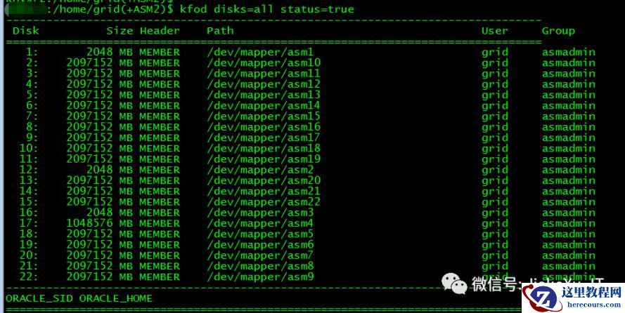 读 ASM 使用的所有磁盘以及大小和磁盘相关路径jieke2:/home/grid(+ASM2)$ kfod disks=all status=true-------------------------------------------------------------------------------- Disk Size Header Path User Group ================================================================================ 1: 2048 MB MEMBER /dev/mapper/asm1 grid asmadmin 2: 2097152 MB MEMBER /dev/mapper/asm10 grid asmadmin 3: 2097152 MB MEMBER /dev/mapper/asm11 grid asmadmin 4: 2097152 MB MEMBER /dev/mapper/asm12 grid asmadmin 5: 2097152 MB MEMBER /dev/mapper/asm13 grid asmadmin 6: 2097152 MB MEMBER /dev/mapper/asm14 grid asmadmin 7: 2097152 MB MEMBER /dev/mapper/asm15 grid asmadmin 8: 2097152 MB MEMBER /dev/mapper/asm16 grid asmadmin 9: 2097152 MB MEMBER /dev/mapper/asm17 grid asmadmin 10: 2097152 MB MEMBER /dev/mapper/asm18 grid asmadmin 11: 2097152 MB MEMBER /dev/mapper/asm19 grid asmadmin 12: 2048 MB MEMBER /dev/mapper/asm2 grid asmadmin 13: 2097152 MB MEMBER /dev/mapper/asm20 grid asmadmin 14: 2097152 MB MEMBER /dev/mapper/asm21 grid asmadmin 15: 2097152 MB MEMBER /dev/mapper/asm22 grid asmadmin 16: 2048 MB MEMBER /dev/mapper/asm3 grid asmadmin 17: 1048576 MB MEMBER /dev/mapper/asm4 grid asmadmin 18: 2097152 MB MEMBER /dev/mapper/asm5 grid asmadmin 19: 2097152 MB MEMBER /dev/mapper/asm6 grid asmadmin 20: 2097152 MB MEMBER /dev/mapper/asm7 grid asmadmin 21: 2097152 MB MEMBER /dev/mapper/asm8 grid asmadmin 22: 2097152 MB MEMBER /dev/mapper/asm9 grid asmadmin--------------------------------------------------------------------------------ORACLE_SID ORACLE_HOME ================================================================================