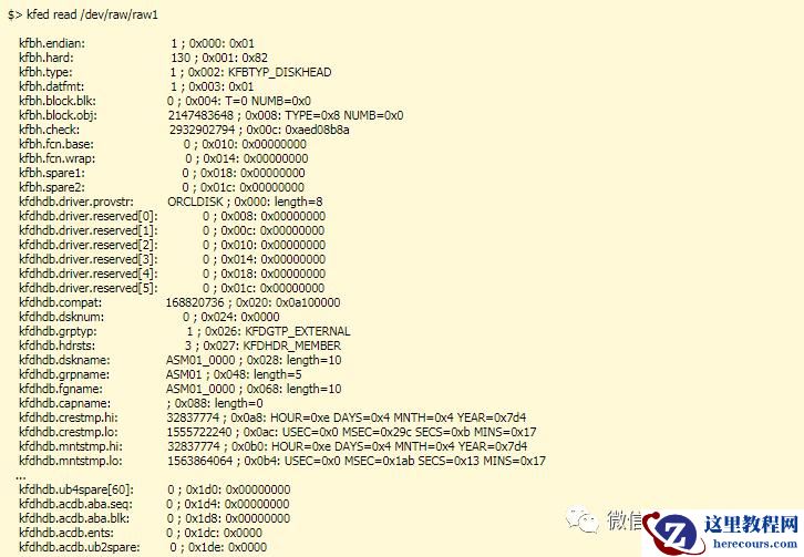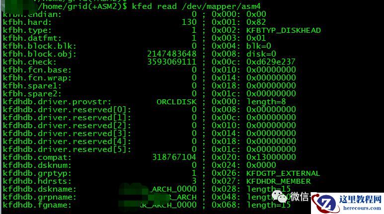 jieke2:/home/grid(+ASM2)$ kfed read /dev/mapper/asm4kfbh.endian: 0 ; 0x000: 0x00kfbh.hard: 130 ; 0x001: 0x82kfbh.type: 1 ; 0x002: KFBTYP_DISKHEADkfbh.datfmt: 1 ; 0x003: 0x01kfbh.block.blk: 0 ; 0x004: blk=0kfbh.block.obj: 2147483648 ; 0x008: disk=0kfbh.check: 3593069111 ; 0x00c: 0xd629e237kfbh.fcn.base: 0 ; 0x010: 0x00000000kfbh.fcn.wrap: 0 ; 0x014: 0x00000000kfbh.spare1: 0 ; 0x018: 0x00000000kfbh.spare2: 0 ; 0x01c: 0x00000000kfdhdb.driver.provstr: ORCLDISK ; 0x000: length=8kfdhdb.driver.reserved[0]: 0 ; 0x008: 0x00000000kfdhdb.driver.reserved[1]: 0 ; 0x00c: 0x00000000kfdhdb.driver.reserved[2]: 0 ; 0x010: 0x00000000kfdhdb.driver.reserved[3]: 0 ; 0x014: 0x00000000kfdhdb.driver.reserved[4]: 0 ; 0x018: 0x00000000kfdhdb.driver.reserved[5]: 0 ; 0x01c: 0x00000000kfdhdb.compat: 318767104 ; 0x020: 0x13000000kfdhdb.dsknum: 0 ; 0x024: 0x0000kfdhdb.grptyp: 1 ; 0x026: KFDGTP_EXTERNALkfdhdb.hdrsts: 3 ; 0x027: KFDHDR_MEMBERkfdhdb.dskname: JIEKE_ARCH_0000 ; 0x028: length=15kfdhdb.grpname: JIEKE_ARCH ; 0x048: length=10kfdhdb.fgname: JIEKE_ARCH_0000 ; 0x068: length=15kfdhdb.siteguid[0]: 0 ; 0x088: 0x00kfdhdb.siteguid[1]: 0 ; 0x089: 0x00kfdhdb.siteguid[2]: 0 ; 0x08a: 0x00