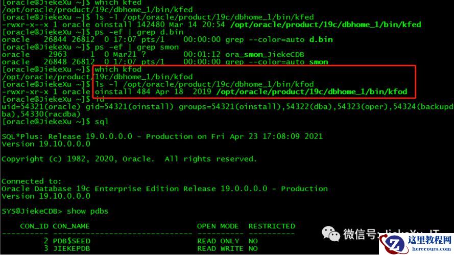 [root@JiekeXu ~]# su - oracleLast login: Tue Apr 20 09:21:16 CST 2021 on pts/1[oracle@JiekeXu ~]$ which kfed/opt/oracle/product/19c/dbhome_1/bin/kfed[oracle@JiekeXu ~]$ ls -l /opt/oracle/product/19c/dbhome_1/bin/kfed-rwxr-x--x 1 oracle oinstall 142480 Mar 14 20:54 /opt/oracle/product/19c/dbhome_1/bin/kfed[oracle@JiekeXu ~]$ ps -ef | grep d.binoracle 26844 26812 0 17:07 pts/1 00:00:00 grep --color=auto d.bin[oracle@JiekeXu ~]$ ps -ef | grep smonoracle 2963 1 0 Mar21 ? 00:01:12 ora_smon_JiekeCDBoracle 26848 26812 0 17:07 pts/1 00:00:00 grep --color=auto smon[oracle@JiekeXu ~]$ which kfod/opt/oracle/product/19c/dbhome_1/bin/kfod[oracle@JiekeXu ~]$ ls -l /opt/oracle/product/19c/dbhome_1/bin/kfod-rwxr-xr-x 1 oracle oinstall 484 Apr 18 2019 /opt/oracle/product/19c/dbhome_1/bin/kfod[oracle@JiekeXu ~]$ iduid=54321(oracle) gid=54321(oinstall) groups=54321(oinstall),54322(dba),54323(oper),54324(backupdba),54325(dgdba),54326(kmdba),54330(racdba)[oracle@JiekeXu ~]$ sqlSQL*Plus: Release 19.0.0.0.0 - Production on Fri Apr 23 17:08:09 2021Version 19.10.0.0.0Copyright (c) 1982, 2020, Oracle. All rights reserved.Connected to:Oracle Database 19c Enterprise Edition Release 19.0.0.0.0 - ProductionVersion 19.10.0.0.0SYS@JiekeCDB> show pdbsCON_ID CON_NAME OPEN MODE RESTRICTED---------- ------------------------------ ---------- ----------2 PDB$SEED READ ONLY NO3 JIEKEPDB READ WRITE NO5 JIEKEPDB1 READ WRITE NO19c RAC 环境jieke2:/home/grid(+ASM2)$ which kfod/u01/app/19.0.0.0/grid/bin/kfodjieke2:/home/grid(+ASM2)$ which kfed/u01/app/19.0.0.0/grid/bin/kfedjieke2:/home/grid(+ASM2)$ ls -l /u01/app/19.0.0.0/grid/bin/kfed-rwxr-x--x 1 root oinstall 102416 Apr 22 17:00 /u01/app/19.0.0.0/grid/bin/kfedjieke2:/home/grid(+ASM2)$ which amdu/u01/app/19.0.0.0/grid/bin/amdujieke2:/home/grid(+ASM2)$ ls -l /u01/app/19.0.0.0/grid/bin/amdu-rwxr-x--x 1 root oinstall 131072 Apr 22 17:00 /u01/app/19.0.0.0/grid/bin/amdujieke2:/home/grid(+ASM2)$ exitlogoutjieke2:~ # su - oraclejieke2:/home/oracle(jiekexu2)$ which kfed/u01/app/oracle/product/19.0.0.0/dbhome_1/bin/kfedjieke2:/home/oracle(jiekexu2)$ ls -l /u01/app/oracle/product/19.0.0.0/dbhome_1/bin/kfed-rwxr-x--x 1 oracle oinstall 98320 Apr 22 22:47 /u01/app/oracle/product/19.0.0.0/dbhome_1/bin/kfed11g 单机环境JIEKEADG:/home/oracle$which kfed/app/product/11.2.0/db/bin/kfedJIEKEADG:/home/oracle$which kfod/app/product/11.2.0/db/bin/kfodJIEKEADG:/home/oracle$which amdu/app/product/11.2.0/db/bin/amdu