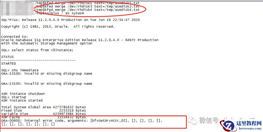 用下面的命令把每一个写回对应的磁盘: kfed merge /dev/rhdisk13 text=asmdisk13.txt