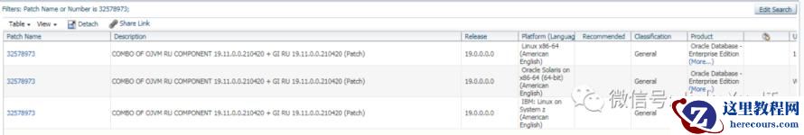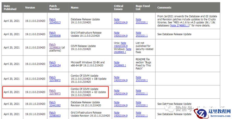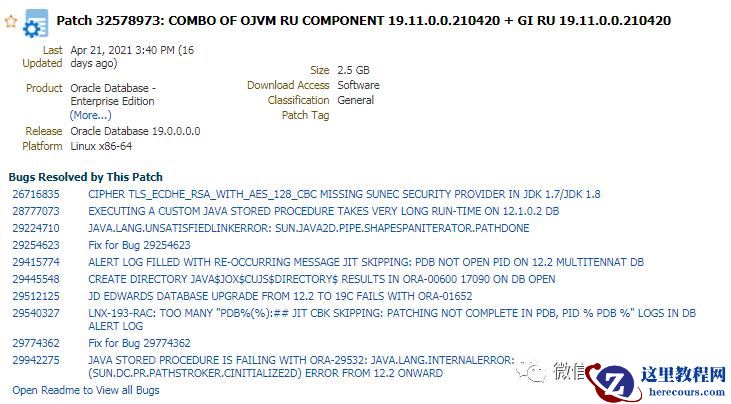 补丁 Patch 32578973: COMBO OF OJVM RU COMPONENT 19.11.0.0.210420 + GI RU 19.11.0.0.210420。包含 OJVM 和 GI + DB 补丁,补丁解决以下 BUG。