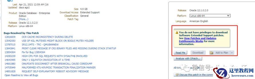 Patch 32579077: COMBO OF OJVM COMPONENT 12.1.0.2.210420 DB PSU + GIPSU 12.1.0.2.210420.可惜生命周期已经终结,不再维护,已经没有权限能够下载补丁了。“您没有下载 Software Extended Support补丁程序的权限。有关详细信息, 请参阅补丁程序和更新程序权利的工作方式。”