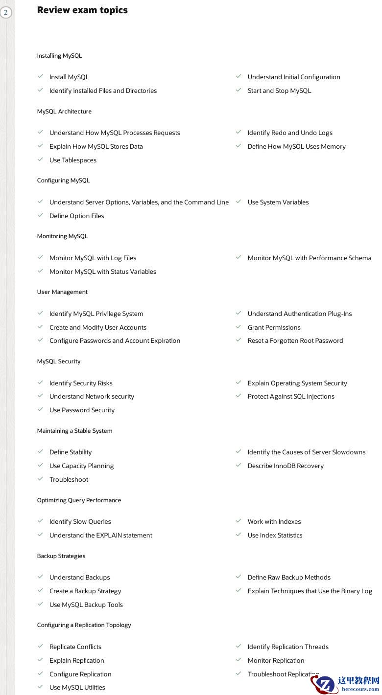 Review exam topicsArchitectureConfigure client connections to the serverUnderstand how MySQL stores dataUnderstand how InnoDB stores data and logsConfigure buffers and cachesUnderstand and use the Data DictionaryServer Installation and ConfigurationInstall and use the MySQL server and client programsIdentify the files and folders created during installationStart and stop MySQLUpgrade MySQLConfigure MySQL by using options and option filesConfigure MySQL variablesLaunch multiple MySQL servers on the same hostSecurityCreate user accounts and rolesUse authentication plug-insControl user and role permissionsRecognize common security risksSecure MySQL server connectionsProvide password and login securitySecure the MySQL host environmentPrevent SQL injection attacksEncrypt MySQL dataConfigure MySQL Enterprise FirewallMonitoring and MaintenanceConfigure and view MySQL log filesMonitor MySQL processes and statusConfigure MySQL Enterprise AuditUse MySQL Enterprise Monitor to view activity in MySQLMonitor database growth and explain capacity planningTroubleshoot problems with locked resourcesQuery OptimizationExamine how MySQL optimizes queriesAnalyze queries with MySQL Enterprise MonitorCreate indexes to improve server performanceMonitor and understand index statisticsBackups and RecoveryDistinguish between the different types of backupImplement a backup strategyBackup and restore data with MySQL Enterprise BackupUse mysqldump and mysqlpump to perform logical backupsExplain when and how to use raw file backupsBack up the binary logHigh Availability TechniquesExplain how replication provides high availability and scalabilityConfigure replicationExplain the role of the binary log in replicationConfigure multisource replicationExplain the role of replication threadsMonitor and troubleshoot replicationDescribe MySQL InnoDB cluster and Group ReplicationConfigure a MySQL InnoDB clusterPerform an InnoDB cluster recovery