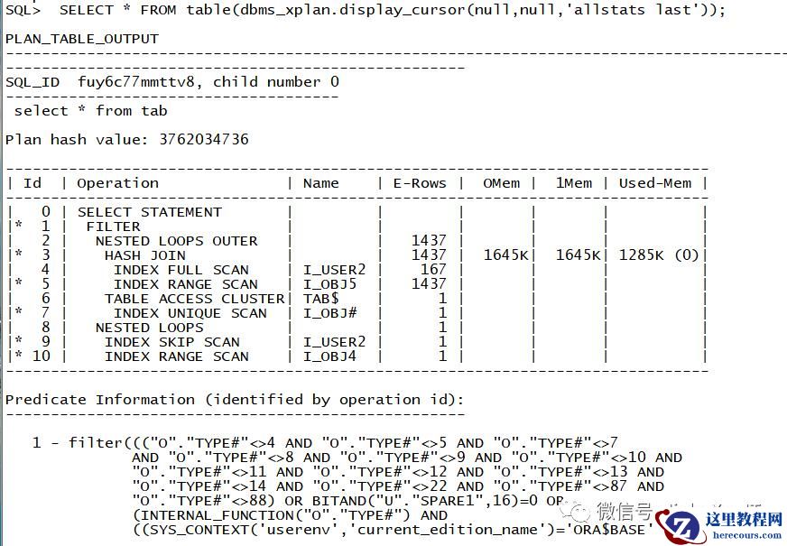 SQL> select * from tab;TNAME TABTYPE CLUSTERID------------------------------ ------- ----------BONUS TABLEDEPT TABLEEMP TABLESALGRADE TABLEElapsed: 00:00:00.01SQL> SELECT * FROM table(dbms_xplan.display_cursor(null,null,'allstats last'));PLAN_TABLE_OUTPUT------------------------------------------------------------------------------------------------------------------------------------------------------------------------------------------------------------------------------------------------SQL_ID 767pug2dbpqpc, child number 0-------------------------------------select * from tabPlan hash value: 3762034736------------------------------------------------------------------------------| Id | Operation | Name | E-Rows | OMem | 1Mem | Used-Mem |------------------------------------------------------------------------------| 0 | SELECT STATEMENT | | | | | ||* 1 | FILTER | | | | | || 2 | NESTED LOOPS OUTER | | 1437 | | | ||* 3 | HASH JOIN | | 1437 | 1645K| 1645K| 1530K (0)|| 4 | INDEX FULL SCAN | I_USER2 | 167 | | | ||* 5 | INDEX RANGE SCAN | I_OBJ5 | 1437 | | | || 6 | TABLE ACCESS CLUSTER| TAB$ | 1 | | | ||* 7 | INDEX UNIQUE SCAN | I_OBJ# | 1 | | | || 8 | NESTED LOOPS | | 1 | | | ||* 9 | INDEX SKIP SCAN | I_USER2 | 1 | | | ||* 10 | INDEX RANGE SCAN | I_OBJ4 | 1 | | | |------------------------------------------------------------------------------
