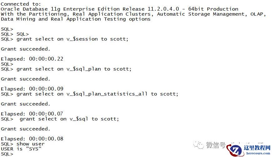 grant select on v_$session to scott;Grant succeeded.Elapsed: 00:00:00.22grant select on v_$sql_plan to scott;Grant succeeded.Elapsed: 00:00:00.09grant select on v_$sql_plan_statistics_all to scott;Grant succeeded.Elapsed: 00:00:00.07grant select on v_$sql to scott;Grant succeeded.