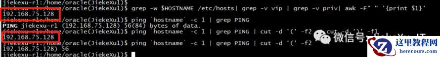 jiekexu-r1:/home/oracle(JiekeXu1)$ grep -w $HOSTNAME /etc/hosts| grep -v vip | grep -v priv| awk -F" " '{print $1}' 192.168.75.128 jiekexu-r1:/home/oracle(JiekeXu1)$ ping `hostname` -c 1 PING jiekexu-r1 (192.168.75.128) 56(84) bytes of data. 64 bytes from jiekexu-r1 (192.168.75.128): icmp_seq=1 ttl=64 time=0.017 ms --- jiekexu-r1 ping statistics --- 1 packets transmitted, 1 received, 0% packet loss, time 0ms rtt min/avg/max/mdev = 0.017/0.017/0.017/0.000 ms jiekexu-r1:/home/oracle(JiekeXu1)$ ping `hostname` -c 1 | grep PING PING jiekexu-r1 (192.168.75.128) 56(84) bytes of data. jiekexu-r1:/home/oracle(JiekeXu1)$ ping `hostname` -c 1 | grep PING | cut -d '(' -f2 192.168.75.128) 56 jiekexu-r1:/home/oracle(JiekeXu1)$ ping `hostname` -c 1 | grep PING | cut -d '(' -f2 192.168.75.128) 56 jiekexu-r1:/home/oracle(JiekeXu1)$ ping `hostname` -c 1 | grep PING | cut -d '(' -f2 | cut -d ')' -f1192.168.75.128