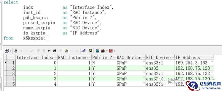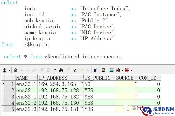 select * from v$configured_interconnects;NAME IP_ADDRESS IS_ SOURCE CON_ID--------------- --- --------------- ----------ens33:1 169.254.3.163 NO 0ens32 192.168.75.128 YES 0ens32:1 192.168.75.132 YES 0ens32:2 192.168.75.130 YES 0------------------------selectindx as "Interface Index",inst_id as "RAC Instance",pub_ksxpia as "Public?",picked_ksxpia as "RAC Device",name_ksxpia as "NIC Device",ip_ksxpia as "IP Address"from x$ksxpia;Interface Index RAC Instance Public? RAC Device NIC Device IP Address------------ ---------- ----------------------------------- --------------- ----------------------------------------------0 1 N GPnP ens33:1 169.254.3.1631 1 Y GPnP ens32 192.168.75.1282 1 Y GPnP ens32:1 192.168.75.1323 1 Y GPnP ens32:2 192.168.75.1304 1 Y GPnP ens32:3 192.168.75.131