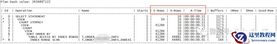 Execution Plan----------------------------------------------------------Plan hash value: 2845846103-------------------------------------------------------------------------------------------------------------| Id | Operation | Name | Rows | Bytes | Cost (%CPU)| Time |-------------------------------------------------------------------------------------------------------------| 0 | SELECT STATEMENT | | 10 | 8160 | 8 (0)| 00:00:01 ||* 1 | VIEW | | 10 | 8160 | 8 (0)| 00:00:01 ||* 2 | COUNT STOPKEY | | | | | || 3 | VIEW | | 11 | 8833 | 8 (0)| 00:00:01 || 4 | TABLE ACCESS BY INDEX ROWID| T_ORDER_INFO | 37872 | 7064K| 8 (0)| 00:00:01 ||* 5 | INDEX RANGE SCAN | T_ORD_INFO_IDQUERY_TRANSNO | 11 | | 4 (0)| 00:00:01 |-------------------------------------------------------------------------------------------------------------Statistics----------------------------------------------------------0 recursive calls0 db block gets10 consistent gets0 physical reads0 redo size2635 bytes sent via SQL*Net to client520 bytes received via SQL*Net from client2 SQL*Net roundtrips to/from client0 sorts (memory)0 sorts (disk)10 rows processed+++++++++++++++++++++++++++++++++++++++++++++++++++++++++++++++++++++++++++++++++++++++++Plan hash value: 2845846103-----------------------------------------------------------------------------------------------------------------------| Id | Operation | Name | Starts | E-Rows | A-Rows | A-Time | Buffers |-----------------------------------------------------------------------------------------------------------------------| 0 | SELECT STATEMENT | | 1 | | 10 |00:00:00.01 | 10 ||* 1 | VIEW | | 1 | 10 | 10 |00:00:00.01 | 10 ||* 2 | COUNT STOPKEY | | 1 | | 10 |00:00:00.01 | 10 || 3 | VIEW | | 1 | 10 | 10 |00:00:00.01 | 10 || 4 | TABLE ACCESS BY INDEX ROWID| T_ORDER_INFO | 1 | 41284 | 10 |00:00:00.01 | 10 ||* 5 | INDEX RANGE SCAN | T_ORD_INFO_IDQUERY_TRANSNO | 1 | 10 | 10 |00:00:00.01 | 5 |-----------------------------------------------------------------------------------------------------------------------