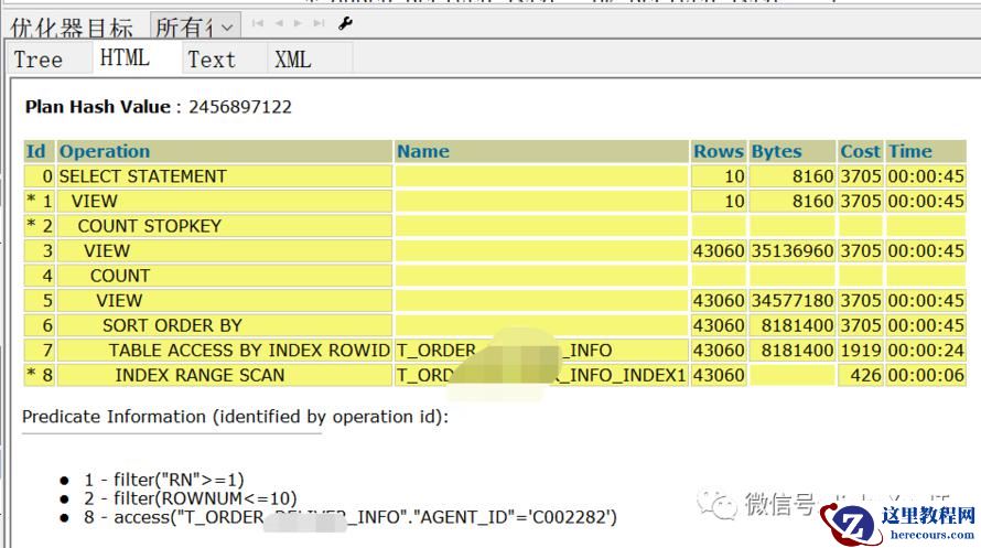 select /*+ index(T_ORDER_INFO T_ORD_INFO_IDQUERY_TRANSNO) */ "T_ORDER_INFO"Execution Plan----------------------------------------------------------Plan hash value: 4173602263---------------------------------------------------------------------------------------------------------------| Id | Operation | Name | Rows | Bytes | Cost (%CPU)| Time |---------------------------------------------------------------------------------------------------------------| 0 | SELECT STATEMENT | | 10 | 8160 | 13303 (1)| 00:02:40 ||* 1 | VIEW | | 10 | 8160 | 13303 (1)| 00:02:40 ||* 2 | COUNT STOPKEY | | | | | || 3 | VIEW | | 41284 | 32M| 13303 (1)| 00:02:40 || 4 | COUNT | | | | | || 5 | VIEW | | 41284 | 31M| 13303 (1)| 00:02:40 || 6 | TABLE ACCESS BY INDEX ROWID| T_ORDER_INFO | 41284 | 7700K| 13303 (1)| 00:02:40 ||* 7 | INDEX RANGE SCAN | T_ORD_INFO_IDQUERY_TRANSNO | 41284 | | 469 (0)| 00:00:06 |---------------------------------------------------------------------------------------------------------------Predicate Information (identified by operation id):---------------------------------------------------1 - filter("RN">=1)2 - filter(ROWNUM<=10)7 - access("T_ORDER_INFO"."AGENT_ID"='C002282')Statistics----------------------------------------------------------1 recursive calls0 db block gets10 consistent gets2 physical reads0 redo size2729 bytes sent via SQL*Net to client520 bytes received via SQL*Net from client2 SQL*Net roundtrips to/from client0 sorts (memory)0 sorts (disk)10 rows processed