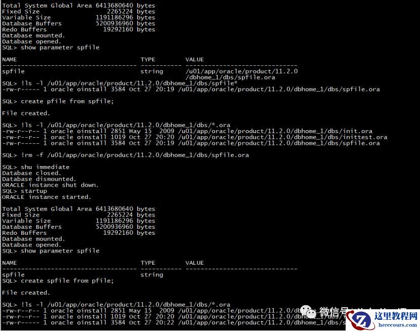 SQL*Plus: Release 11.2.0.4.0 Production on Wed Oct 27 20:19:01 2021Copyright (c) 1982, 2013, Oracle. All rights reserved.Connected to an idle instance.SQL> startupORACLE instance started.Total System Global Area 6413680640 bytesFixed Size 2265224 bytesVariable Size 1191186296 bytesDatabase Buffers 5200936960 bytesRedo Buffers 19292160 bytesDatabase mounted.Database opened.SQL> show parameter spfileNAME TYPE VALUE------------------------------------ ----------- ------------------------------spfile string /u01/app/oracle/product/11.2.0/dbhome_1/dbs/spfile.oraSQL> !ls -l /u01/app/oracle/product/11.2.0/dbhome_1/dbs/spfile*-rw-r----- 1 oracle oinstall 3584 Oct 27 20:19 /u01/app/oracle/product/11.2.0/dbhome_1/dbs/spfile.oraSQL> create pfile from spfile;File created.SQL> !ls -l /u01/app/oracle/product/11.2.0/dbhome_1/dbs/*.ora-rw-r--r-- 1 oracle oinstall 2851 May 15 2009 /u01/app/oracle/product/11.2.0/dbhome_1/dbs/init.ora-rw-r--r-- 1 oracle oinstall 1019 Oct 27 20:20 /u01/app/oracle/product/11.2.0/dbhome_1/dbs/inittest.ora-rw-r----- 1 oracle oinstall 3584 Oct 27 20:19 /u01/app/oracle/product/11.2.0/dbhome_1/dbs/spfile.oraSQL> !rm -f /u01/app/oracle/product/11.2.0/dbhome_1/dbs/spfile.oraSQL> shu immediateDatabase closed.Database dismounted.ORACLE instance shut down.SQL> startupORACLE instance started.Total System Global Area 6413680640 bytesFixed Size 2265224 bytesVariable Size 1191186296 bytesDatabase Buffers 5200936960 bytesRedo Buffers 19292160 bytesDatabase mounted.Database opened.SQL> show parameter spfileNAME TYPE VALUE------------------------------------ ----------- ------------------------------spfile stringSQL> create spfile from pfile;File created.SQL> !ls -l /u01/app/oracle/product/11.2.0/dbhome_1/dbs/*.ora-rw-r--r-- 1 oracle oinstall 2851 May 15 2009 /u01/app/oracle/product/11.2.0/dbhome_1/dbs/init.ora-rw-r--r-- 1 oracle oinstall 1019 Oct 27 20:20 /u01/app/oracle/product/11.2.0/dbhome_1/dbs/inittest.ora-rw-r----- 1 oracle oinstall 3584 Oct 27 20:22 /u01/app/oracle/product/11.2.0/dbhome_1/dbs/spfiletest.oraSQL> shu immediateDatabase closed.Database dismounted.ORACLE instance shut down.SQL> startupORACLE instance started.Total System Global Area 6413680640 bytesFixed Size 2265224 bytesVariable Size 1191186296 bytesDatabase Buffers 5200936960 bytesRedo Buffers 19292160 bytesDatabase mounted.Database opened.SQL> show parameter spfileNAME TYPE VALUE------------------------------------ ----------- ------------------------------spfile string /u01/app/oracle/product/11.2.0/dbhome_1/dbs/spfiletest.ora