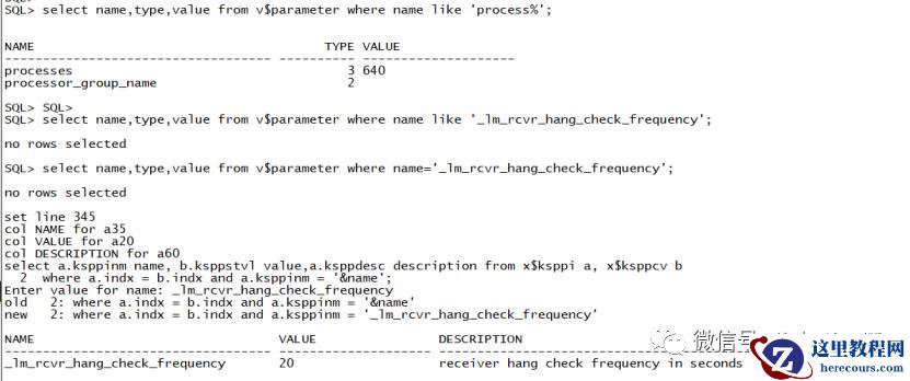 set line 345col NAME for a35col VALUE for a20col DESCRIPTION for a60select a.ksppinm name, b.ksppstvl value,a.ksppdesc description from x$ksppi a, x$ksppcv bwhere a.indx = b.indx and a.ksppinm = '&name';