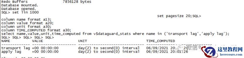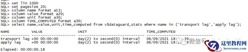 column name format a13;column value format a20;column unit format a30;column TIME_COMPUTED format a30;select name,value,unit,time_computed from v$dataguard_stats where name in ('transport lag','apply lag');