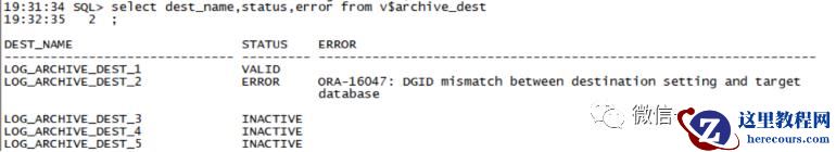 select dest_name,status,error from v$archive_dest; 19:37:22 SQL> show parameter LOG_ARCHIVE_DEST_2 NAME TYPE VALUE------------------------------------ ----------- ------------------------------log_archive_dest_2 string SERVICE=EDWSTB LGWR ASYNC VALI D_FOR=(ONLINE_LOGFILES,PRIMARY _ROLE) DB_UNIQUE_NAME=edw 19:37:32 SQL> alter system set LOG_ARCHIVE_DEST_2='SERVICE=EDW LGWR ASYNC VALID_FOR=(ONLINE_LOGFILES,PRIMARY_ROLE) DB_UNIQUE_NAME=edw'; System altered. Elapsed: 00:00:00.0319:38:20 SQL> select dest_name,status,error from v$archive_dest; DEST_NAME STATUS ERROR------------------------------ --------- -----------------------------------------------------------------LOG_ARCHIVE_DEST_1 VALIDLOG_ARCHIVE_DEST_2 VALIDLOG_ARCHIVE_DEST_3 INACTIVE