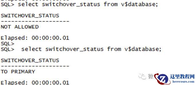 SQL>SELECT SWITCHOVER_STATUS FROM V$DATABASE;SWITCHOVER_STATUS--------------------TO PRIMARY --如果备库为 SESSIONS ACTIVE 但查询没有会话则可以重启一下