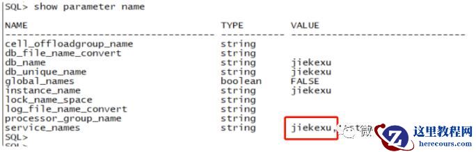 show parameter nameNAME TYPE VALUE----------- ------------------------------cell_offloadgroup_name stringdb_file_name_convert stringdb_name string jiekexudb_unique_name string jiekexuglobal_names boolean FALSEinstance_name string jiekexulock_name_space stringlog_file_name_convert stringoptimizer_dynamic_sampling integer 2processor_group_name stringservice_names string jiekexu,test,orcl,scott