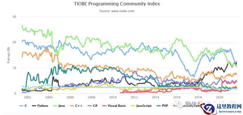TOP 10 编程语言 TIOBE 指数走势(2002-2020)