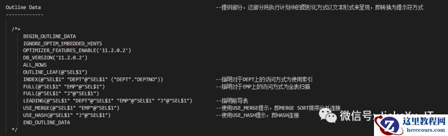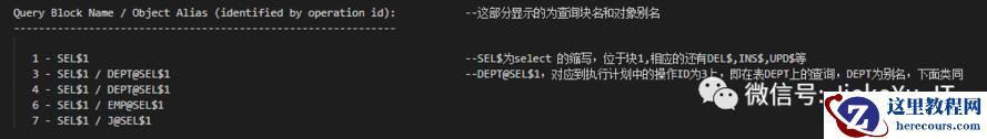 Query Block Name / Object Alias (identified by operation id): --这部分显示的为查询块名和对象别名------------------------------------------------------------- 1 - SEL$1 --SEL$为select 的缩写,位于块1,相应的还有DEL$,INS$,UPD$等 3 - SEL$1 / DEPT@SEL$1 --DEPT@SEL$1,对应到执行计划中的操作ID为3上,即在表DEPT上的查询,DEPT为别名,下面类同 4 - SEL$1 / DEPT@SEL$1 6 - SEL$1 / EMP@SEL$1 7 - SEL$1 / J@SEL$1