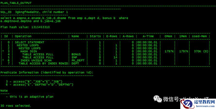 set autot onselect e.empno,e.ename,b.job,d.dname from emp e,dept d, bonus b where e.deptno=d.deptno and b.job=e.job;Execution Plan----------------------------------------------------------Plan hash value: 1315453310----------------------------------------------------------------------------------------| Id | Operation | Name | Rows | Bytes | Cost (%CPU)| Time |----------------------------------------------------------------------------------------| 0 | SELECT STATEMENT | | 1 | 40 | 6 (0)| 00:00:01 || 1 | NESTED LOOPS | | 1 | 40 | 6 (0)| 00:00:01 || 2 | NESTED LOOPS | | 1 | 40 | 6 (0)| 00:00:01 ||* 3 | HASH JOIN | | 1 | 27 | 5 (0)| 00:00:01 || 4 | TABLE ACCESS FULL | BONUS | 1 | 6 | 2 (0)| 00:00:01 || 5 | TABLE ACCESS FULL | EMP | 14 | 294 | 3 (0)| 00:00:01 ||* 6 | INDEX UNIQUE SCAN | PK_DEPT | 1 | | 0 (0)| 00:00:01 || 7 | TABLE ACCESS BY INDEX ROWID| DEPT | 1 | 13 | 1 (0)| 00:00:01 |----------------------------------------------------------------------------------------Predicate Information (identified by operation id):---------------------------------------------------3 - access("B"."JOB"="E"."JOB")6 - access("E"."DEPTNO"="D"."DEPTNO")Note------ this is an adaptive plan---优点。1. 可以输出运行时的相关统计信息(产生多少逻辑读,多少次递归调用,多少次物理读的情况),2 . 虽然必须要等语句执行完毕后才可以输出执行计划 , 但是可以有 traceonly 开关来控制返回结果不打屏输出。---缺陷 1. 必须要等到语句真正执行完毕后,才可以出结果,2. 无法看到表被访问了多少次。