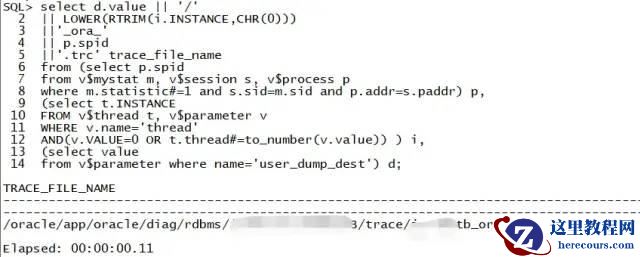 步骤 4:select d.value || '/'|| LOWER(RTRIM(i.INSTANCE,CHR(0)))||'_ora_'|| p.spid||'.trc' trace_file_namefrom (select p.spidfrom v$mystat m, v$session s, v$process pwhere m.statistic#=1 and s.sid=m.sid and p.addr=s.paddr) p,(select t.INSTANCEFROM v$thread t, v$parameter vWHERE v.name='thread'AND(v.VALUE=0 OR t.thread#=to_number(v.value)) ) i,(select value from v$parameter where name='user_dump_dest') d;tkprof /oracle/app/oracle/diag/rdbms/PROD/PRODSTB/trace/PROD_ora_7238.trc /tmp/10046_sql.log sys=no sort=prsela,exeela,fchelacat /tmp/10046_sql.log********************************************************************************OVERALL TOTALS FOR ALL NON-RECURSIVE STATEMENTScall count cpu elapsed disk query current rows------- ------ -------- ---------- ---------- ---------- ---------- ----------Parse 2 0.00 0.00 0 0 0 0Execute 2 0.00 0.00 0 0 0 0Fetch 2 1.08 1.78 9568 10117 0 1------- ------ -------- ---------- ---------- ---------- ---------- ----------total 6 1.09 1.79 9568 10117 0 1Misses in library cache during parse: 1Elapsed times include waiting on following events:Event waited on Times Max. Wait Total Waited---------------------------------------- Waited ---------- ------------SQL*Net message to client 3 0.00 0.00SQL*Net message from client 3 31.01 55.20db file sequential read 130 0.01 0.13db file scattered read 274 0.03 1.07OVERALL TOTALS FOR ALL RECURSIVE STATEMENTScall count cpu elapsed disk query current rows------- ------ -------- ---------- ---------- ---------- ---------- ----------Parse 0 0.00 0.00 0 0 0 0Execute 0 0.00 0.00 0 0 0 0Fetch 0 0.00 0.00 0 0 0 0------- ------ -------- ---------- ---------- ---------- ---------- ----------total 0 0.00 0.00 0 0 0 0Misses in library cache during parse: 02 user SQL statements in session.0 internal SQL statements in session.2 SQL statements in session.********************************************************************************