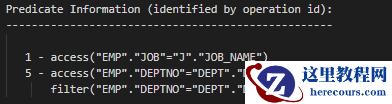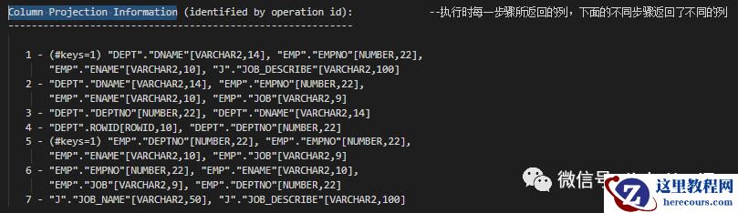 Column Projection Information (identified by operation id): --执行时每一步骤所返回的列,下面的不同步骤返回了不同的列----------------------------------------------------------- 1 - (#keys=1) "DEPT"."DNAME"[VARCHAR2,14], "EMP"."EMPNO"[NUMBER,22], "EMP"."ENAME"[VARCHAR2,10], "J"."JOB_DESCRIBE"[VARCHAR2,100] 2 - "DEPT"."DNAME"[VARCHAR2,14], "EMP"."EMPNO"[NUMBER,22], "EMP"."ENAME"[VARCHAR2,10], "EMP"."JOB"[VARCHAR2,9] 3 - "DEPT"."DEPTNO"[NUMBER,22], "DEPT"."DNAME"[VARCHAR2,14] 4 - "DEPT".ROWID[ROWID,10], "DEPT"."DEPTNO"[NUMBER,22] 5 - (#keys=1) "EMP"."DEPTNO"[NUMBER,22], "EMP"."EMPNO"[NUMBER,22], "EMP"."ENAME"[VARCHAR2,10], "EMP"."JOB"[VARCHAR2,9] 6 - "EMP"."EMPNO"[NUMBER,22], "EMP"."ENAME"[VARCHAR2,10], "EMP"."JOB"[VARCHAR2,9], "EMP"."DEPTNO"[NUMBER,22] 7 - "J"."JOB_NAME"[VARCHAR2,50], "J"."JOB_DESCRIBE"[VARCHAR2,100]