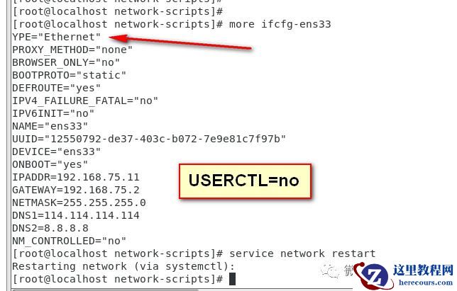 [root@localhost network-scripts]# more /etc/sysconfig/network-scripts/ifcfg-ens33 TYPE="Ethernet"PROXY_METHOD="none"BROWSER_ONLY="no"BOOTPROTO="static"DEFROUTE="yes"IPV4_FAILURE_FATAL="no"IPV6INIT="no"NAME="ens33"UUID="12550792-de37-403c-b072-7e9e81c7f97b"DEVICE="ens33"ONBOOT="yes"USERCTL=noIPADDR=192.168.75.13GATEWAY=192.168.75.2NETMASK=255.255.255.0DNS1=114.114.114.114DNS2=8.8.8.8NM_CONTROLLED="no"[root@localhost network-scripts]# [root@localhost network-scripts]# service network restartRestarting network (via systemctl): [ OK ]