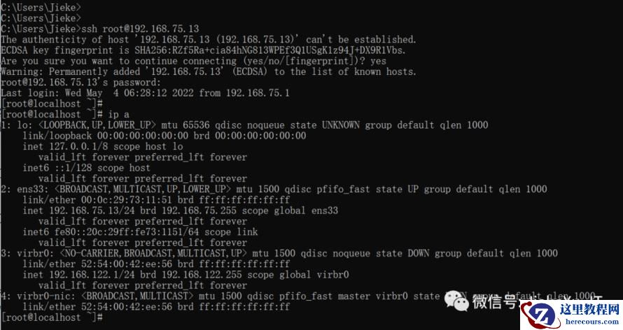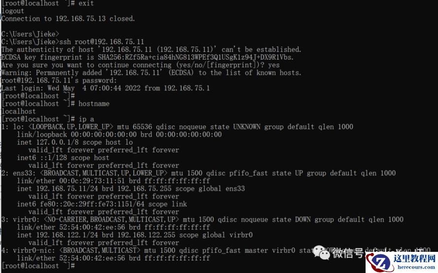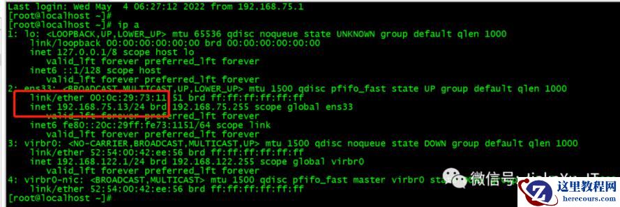 [root@localhost network-scripts]# ip a1: lo: <LOOPBACK,UP,LOWER_UP> mtu 65536 qdisc noqueue state UNKNOWN group default qlen 1000 link/loopback 00:00:00:00:00:00 brd 00:00:00:00:00:00 inet 127.0.0.1/8 scope host lo valid_lft forever preferred_lft forever inet6 ::1/128 scope host valid_lft forever preferred_lft forever2: ens33: <BROADCAST,MULTICAST,UP,LOWER_UP> mtu 1500 qdisc pfifo_fast state UP group default qlen 1000 link/ether 00:0c:29:73:11:51 brd ff:ff:ff:ff:ff:ff inet 192.168.75.11/24 brd 192.168.75.255 scope global ens33 valid_lft forever preferred_lft forever inet6 fe80::20c:29ff:fe73:1151/64 scope link valid_lft forever preferred_lft forever3: virbr0: <NO-CARRIER,BROADCAST,MULTICAST,UP> mtu 1500 qdisc noqueue state DOWN group default qlen 1000 link/ether 52:54:00:42:ee:56 brd ff:ff:ff:ff:ff:ff inet 192.168.122.1/24 brd 192.168.122.255 scope global virbr0 valid_lft forever preferred_lft forever4: virbr0-nic: <BROADCAST,MULTICAST> mtu 1500 qdisc pfifo_fast master virbr0 state DOWN group default qlen 1000 link/ether 52:54:00:42:ee:56 brd ff:ff:ff:ff:ff:ff
