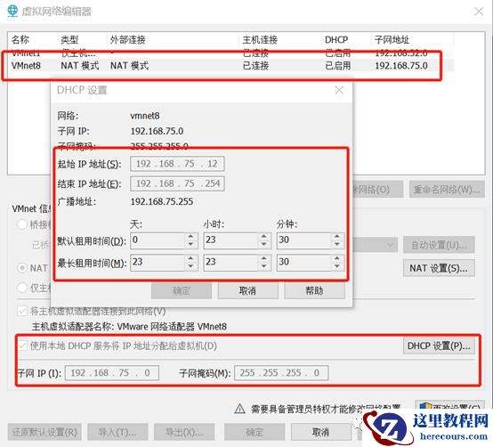 最后,说一下 Linux 虚拟机配置可以上网的方法,虚拟机设置里网络适配器选择【NAT】模式,查看宿主机无线适配器关于 net8 的网络配置,然后 VM 里选择【编辑】——>【虚拟网络编辑器】——>【DHCP设置】,子网 IP 需要和前面看到的在同一网段里,然后选择 DHCP 自动获取。