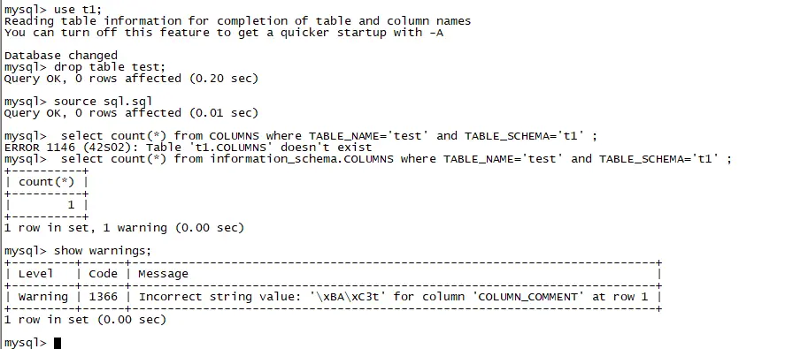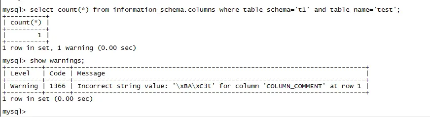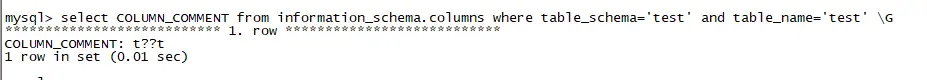 mysql> select hex(COLUMN_COMMENT) from information_schema.columns where table_schema='t1' and table_name='test1' \G*************************** 1. row ***************************hex(COLUMN_COMMENT): 74E5A5BD741 row in set (0.00 sec)mysql> select COLUMN_COMMENT from information_schema.columns where table_schema='t1' and table_name='test1' \G