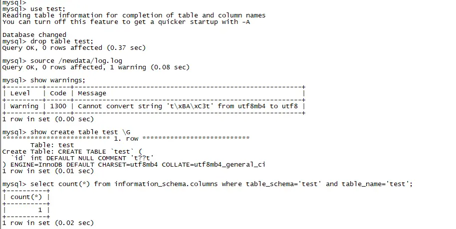 上面的案例 8.0中测试,发现有了变化,当建立的时候就会抛出错误警告,并且出现乱码,代表无法识别comment的字符集。如下,
