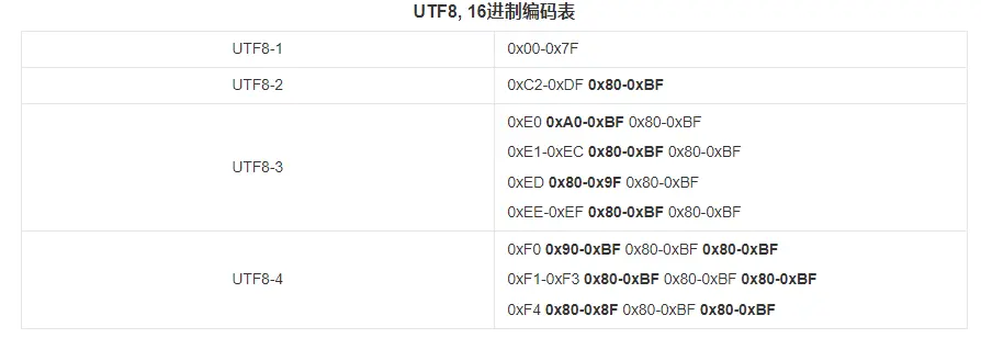 从报错来看其中有字节 \xBA\xC3 也就是0XBAC3无法被解析(这个码点实际上是GBK的'好'字),而对于 information_schema.columns的字段COLUMN_COMMENT字符集为UTF8类型,因此实际上就是0XBAC3无法被解析为UTF8字符,下面我将网上找到的UTF8编码的范围放出来如下,