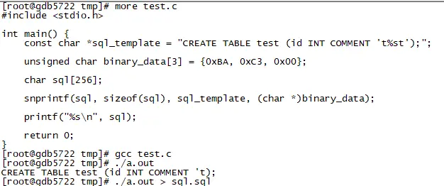 这里我们简单用一个C代码,输出以下就可以生成语句了,我们在comment中加入两个二进制的字符,并且这两个字符就是0xBAC3,实际上是'好'字的GBK编码,并且这是不能被UTF8直接解析的编码,