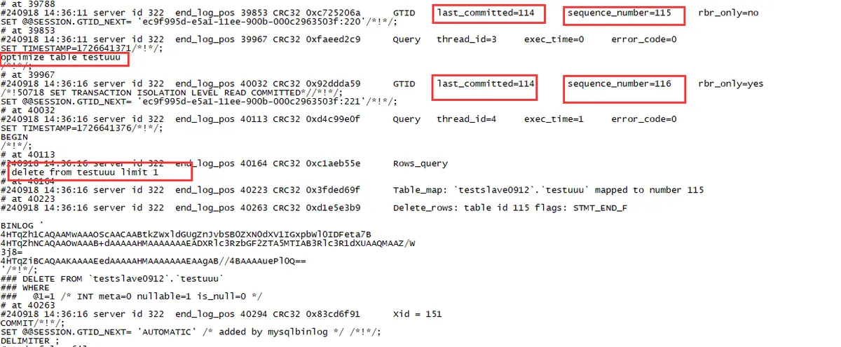 breakpoint already hit 13 times7.1 y 0x000000000142295a in MDL_context::release_lock(enum_mdl_duration, MDL_ticket*) at /opt/mysql-5.7.40/sql/mdl.cc:42867.2 y 0x0000000001422cd2 in MDL_context::release_lock(MDL_ticket*) at /opt/mysql-5.7.40/sql/mdl.cc:4417(gdb) d 6#240918 11:29:49 server id 322 end_log_pos 28019 CRC32 0xecee4a11 GTID last_committed=81 sequence_number=82 rbr_only=noSET @@SESSION.GTID_NEXT= 'ec9f995d-e5a1-11ee-900b-000c2963503f:104'/*!*/;# at 28019#240918 11:29:49 server id 322 end_log_pos 28133 CRC32 0x7aba525e Query thread_id=4 exec_time=1 error_code=0SET TIMESTAMP=1726630189/*!*/;optimize table testuuu/*!*/;# at 28133#240918 11:29:55 server id 322 end_log_pos 28198 CRC32 0x6b33d92a GTID last_committed=81 sequence_number=83 rbr_only=yes/*!50718 SET TRANSACTION ISOLATION LEVEL READ COMMITTED*//*!*/;SET @@SESSION.GTID_NEXT= 'ec9f995d-e5a1-11ee-900b-000c2963503f:105'/*!*/;# at 28198#240918 11:29:55 server id 322 end_log_pos 28279 CRC32 0x76c956ab Query thread_id=5 exec_time=0 error_code=0SET TIMESTAMP=1726630195/*!*/;BEGIN/*!*/;# at 28279#240918 11:29:55 server id 322 end_log_pos 28330 CRC32 0xb13102e7 Rows_query# delete from testuuu limit 1# at 28330#240918 11:29:55 server id 322 end_log_pos 28389 CRC32 0x621ca080 Table_map: `testslave0912`.`testuuu` mapped to number 117# at 28389#240918 11:29:55 server id 322 end_log_pos 28429 CRC32 0x98691042 Delete_rows: table id 117 flags: STMT_END_FBINLOG '