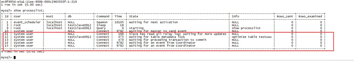 最近遇到一个案例,以前从来没遇到过,环境为5.7,从库在执行optimize table语句的时候,出现了MTS hang死的情况,并且无法自动解锁,只能是重启整个数据库(kill -9),然后才可能恢复。模拟的截图如下,