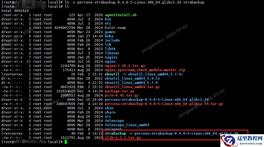 [root@mysql local]# ln -s percona-xtrabackup-8.4.0-5-Linux-x86_64.glibc2.34 xtrabackup [root@mysql local]# ll total 4692820 -rwxr-xr-x 1 root root 225 Apr 17 2020 agentInstall.sh drwxr-xr-x. 2 root root 4096 Jul 3 2024 bin drwxr-xr-x. 2 root root 4096 Jul 3 2024 etc -rw------- 1 root root 4294967296 Mar 28 2024 Eulor-swap drwxr-xr-x. 2 root root 4096 Mar 24 2023 games drwxr-xr-x 9 root root 4096 Jan 27 14:44 heka drwxr-xr-x. 2 root root 4096 Feb 26 2024 include drwxr-xr-x. 4 root root 4096 Feb 26 2024 lib drwxr-xr-x. 4 root root 4096 Nov 8 2023 lib64 drwxr-xr-x. 2 root root 4096 Jul 3 2024 libexec drwxr-xr-x 7 root root 4096 Jan 25 2024 nagios drwxr-xr-x 11 root root 4096 Jul 16 2024 nginx -rw-r--r-- 1 root root 1244789 Aug 20 2024 nginx-1.26.2.tar.gz -rw-r--r-- 1 root root 175413 Aug 20 2024 nginx_upstream_check_module-master.zip lrwxrwxrwx 1 root root 26 Feb 2 15:31 obsutil -> obsutil_linux_amd64_5.7.9/ dr-x------ 2 root root 4096 Dec 28 2022 obsutil_linux_amd64_5.4.11 dr-x------ 2 root root 4096 Nov 4 22:52 obsutil_linux_amd64_5.7.9 -rw-r--r-- 1 root root 4661928 Feb 2 15:31 obsutil_linux_amd64.tar.gz -rw-r--r-- 1 root root 152634622 Dec 4 14:29 package.tar.gz -rw-r--r-- 1 root root 2096552 Aug 20 2024 pcre-8.45.tar.gz drwxr-xr-x 7 root root 4096 Dec 15 19:06 percona-xtrabackup-8.4.0-5-Linux-x86_64.glibc2.34 -rw-r--r-- 1 root root 348047669 Feb 4 14:19 percona-xtrabackup-8.4.0-5-Linux-x86_64.glibc2.34.tar.gz drwxr-xr-x. 2 root root 4096 Jul 3 2024 sbin drwxr-xr-x. 6 root root 4096 Feb 26 2024 share drwxr-xr-x. 8 root root 4096 Aug 20 2024 src drwxr-xr-x 4 root root 4096 Mar 28 2024 telescope drwxr-xr-x 3 root root 4096 Mar 28 2024 telescope_linux_amd64 drwx------ 6 root root 4096 Nov 8 2023 uniagent lrwxrwxrwx 1 root root 49 Feb 4 14:22 xtrabackup -> percona-xtrabackup-8.4.0-5-Linux-x86_64.glibc2.34 -rw-r--r-- 1 root root 1512791 Aug 20 2024 zlib-1.3.1.tar.gz