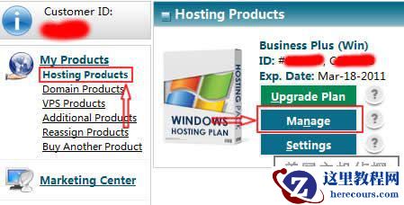 3点击左边的hosting products,右边对应出现主机的产品,点击manage按钮进入其管理页面。